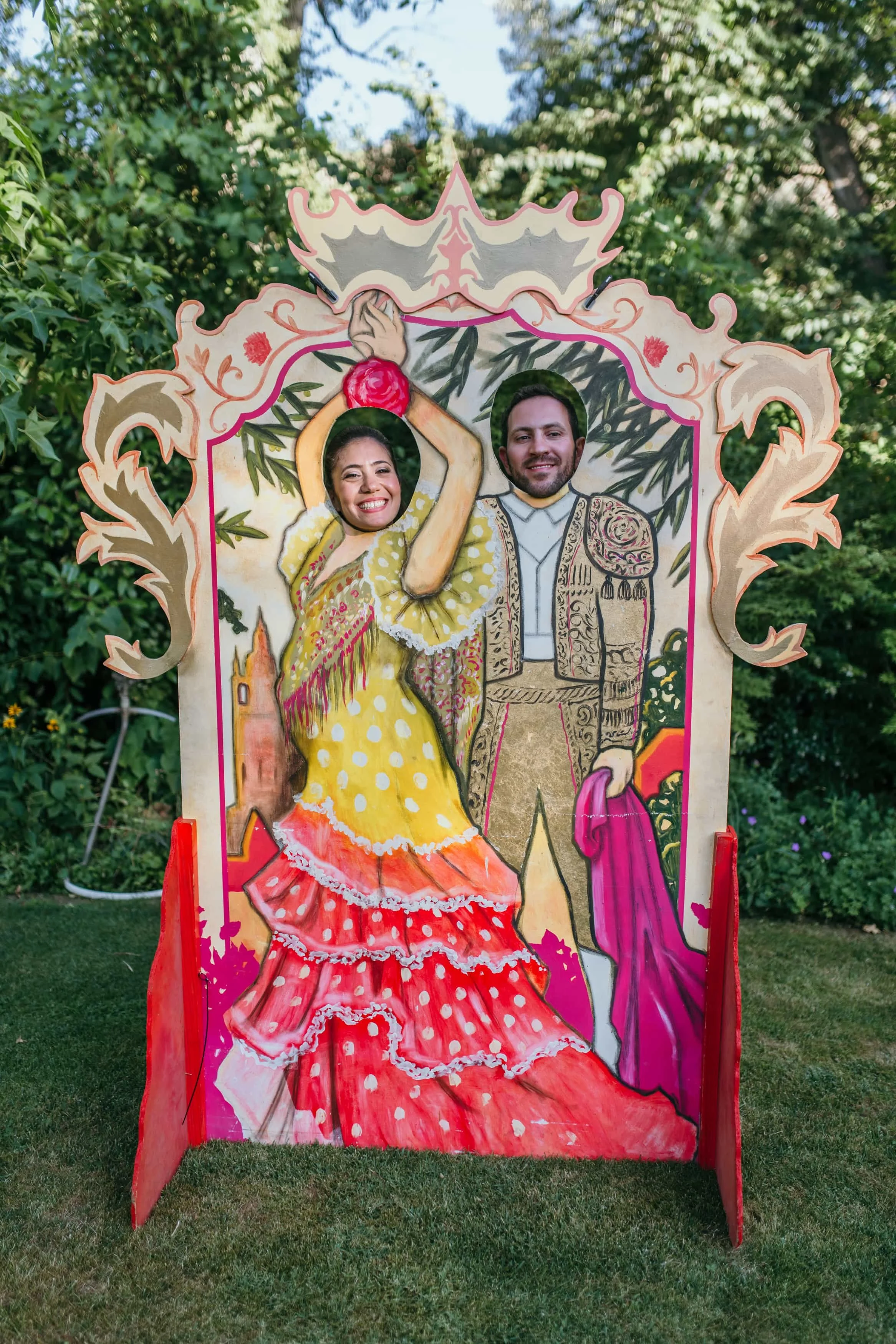 Afterward, guests wandered through the estate’s natural beauty, snapping photos with the estate’s horses on their way to the cocktail hour, where they enjoyed a flamenco-themed photo booth, fun games, and colorful hats for sun protection.